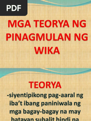Save Save 2pptMGA TEORYA SA PINAGMULAN NG WIKAppt For Later. Batay sa istorya ng Bibliya iisa lang ang wika noong unang panahon kayat walang suliranin sa pakikipagtalastasan ang tao. Tinatanggap ng mga dalubwika na hanggang sa ngayon ay wala pa ring katiyakan ang ibat ibang teorya tungkol sa pinagmulan nito.